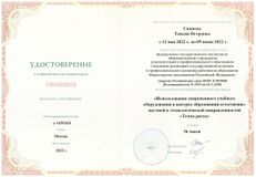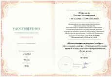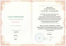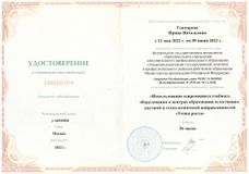 "Инновационные и активные методы обучения учащихся с рисками учебной неуспешности на уроках химиии и биологии ",72 ч.,2021г.; "Психолого-педагогические аспекты инклюзивного образования в условиях реализации ФГОС, 72 ч., 2021 г. ; " Обучение по оказанию первой помощи пострадавшим в ОО",72ч.,2021г."Реализация требований обновленных ФГОС НОО, ФГОС ООО в работе учителя, 36ч., 2022г., " |